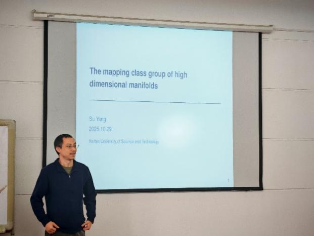 10月29日,应理学院邀请,中国科学院数学与系统科学研究院苏阳研究员在新主楼E1114会议室为学院师生作了题为《高维流形映射类群的若干结果》的学术报告。相关专业教师和研究生约40余人参加此次报告,报告由理学院邱予嘉讲师主持。