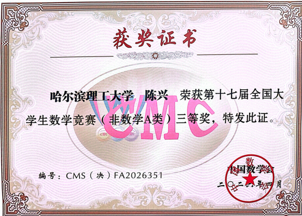 在学校教务处大力支持和组织协调下,理学院组织了从竞赛的报名、预赛筛选到培训和辅导的各个环节。从9月中旬开始,由我校有丰富经验的数学竞赛辅导教师团队,利用一个月的时间对参赛选手进行耐心细致和有针对性地实战训练和辅导,效果十分显著。汪海蓉老师作为指导教师带队参赛,经过紧张的比赛,我校陈兴同学脱颖而出,在本次全国大学生数学竞赛决赛中获得非数学组三等奖,为哈尔滨理工大学争得荣誉。